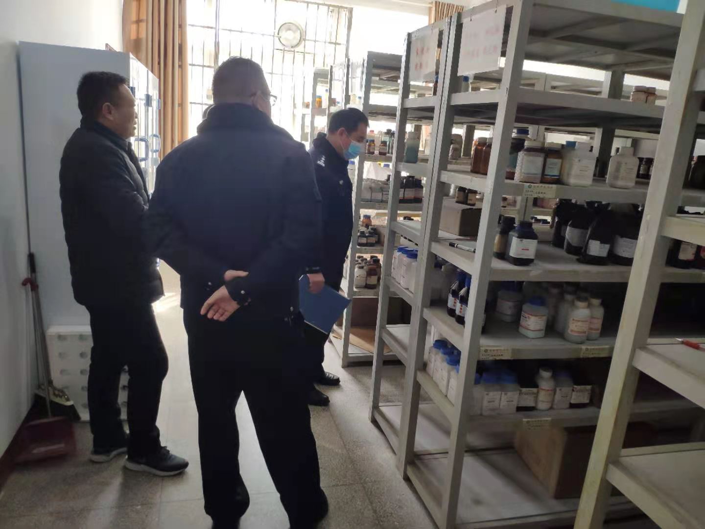 2021年1月18日,信阳市公安局老城派出所民警对Beat365唯一官方网站开展危化品安全检查和指导工作。Beat365唯一官方网站院长井强山、实验室主任于永生及其他实验室安全负责人陪同检查。