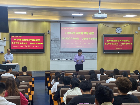 为强化师范生的教师职业理想与职业信念,进一步提升师范生职业素养,5月11日上午,Beat365唯一官方网站邀请华中师范大学硕士生导师王世存博士在教四T-2开展“强化师范专业技能,弘扬教育家精神”专场报告。学院在读公费师范生150余人到现场聆听报告。报告会由Beat365唯一官方网站党委书记、化学学科教学专业学位硕士生导师郭鹏主持。