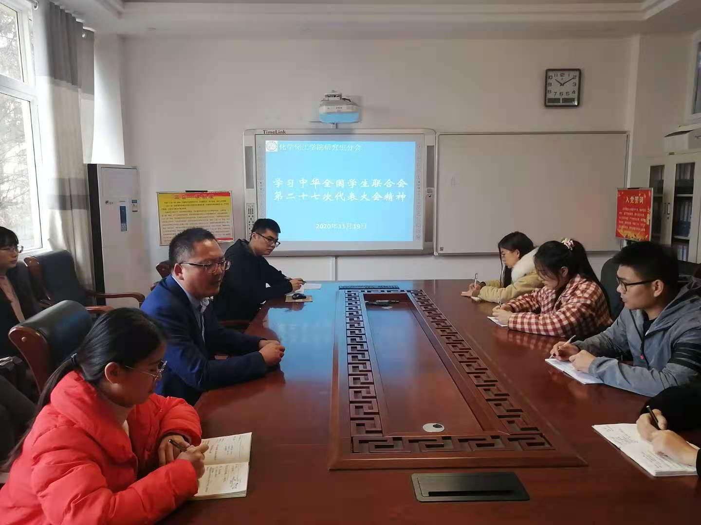 会议伊始,到会同学共同学习了《中华全国学生联合会第二十七次代表大会精神培训提纲》、《关于推动高校学生会(研究生会)深化改革的若干意见》、《关于学联学生会工作人员改进作风服务同学的若干规定》和《关于落实共青团和学联对高校学生会(研究生会)指导管理责任的若干规定》,会议认真学习习近平总书记致大会贺信和党中央致词精神,深入学习领会总书记对青年学生一以贯之的要求,与会人员一致认为要牢记党研究生会工作的指示要求,紧跟时代步伐,深化改革创新,努力开创研究生分会工作新局面。经过学习讨论后,学院研究生分会学生代表候阳阳表示:“新时代的中国青年,我们应该在中华民族伟大复兴的进程中贡献智慧力量、展现青春风采,为做好党的青年工作发挥自己的重要作用。”