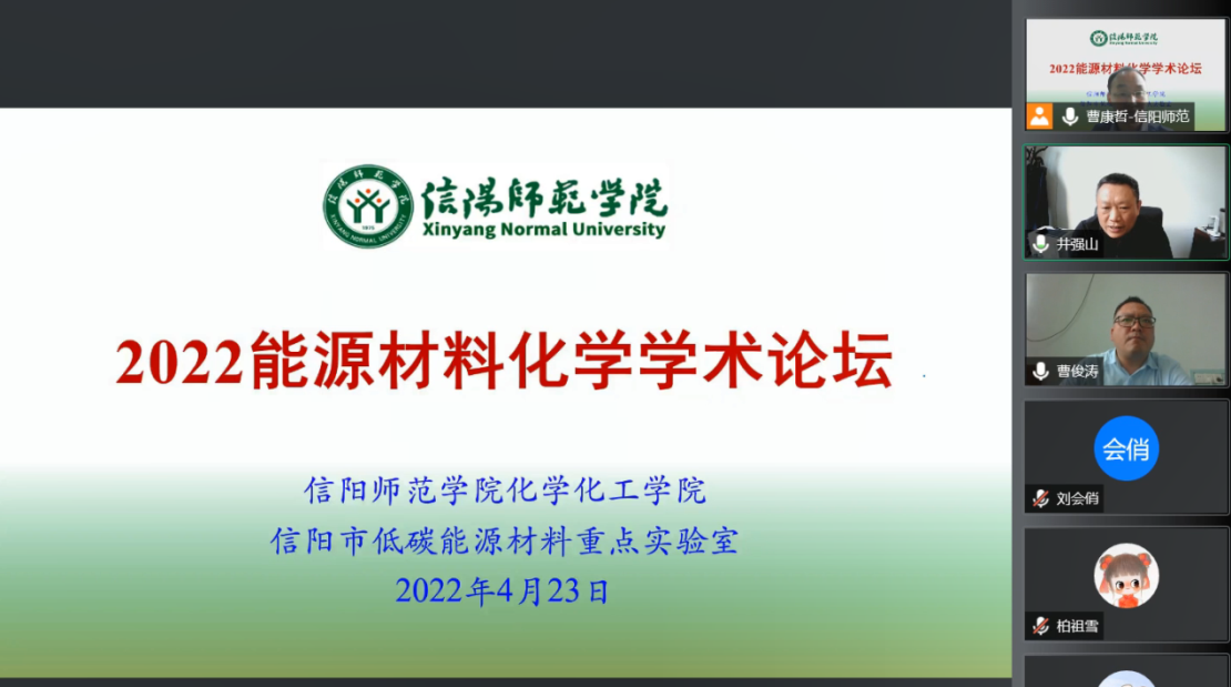 4月23日,由信阳师范学院Beat365唯一官方网站、信阳市低碳能源材料重点实验室承办的“2022能源材料化学学术论坛”线上会议成功召开,我校科技处处长兼Beat365唯一官方网站院长井强山教授做开幕致辞,来自南开大学、清华大学深研院等高校和研究院所的10位业内顶尖学者做大会报告,我校近百名教师和学生参会。
