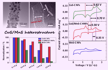 近日,Beat365刘会俏、曹康哲博士研究小组在Chemical Engineering Journal(影响因子:10.6)在线发表题为“Lowering the voltage-hysteresis of CuS anode for Li-ion batteries via constructing heterostructure”研究论文(10.1016/j.cej.2021.130548),信阳师范学院为第一署名单位。该研究针对转化反应负极材料放电电位和充电电位之间的较大滞后电压会降低电极能量效率的问题,通过构筑异质界面促进电荷的分离,改善电化学反应动力学,降低了滞后电压,为构建高能量效率电极材料提供了新思路。
