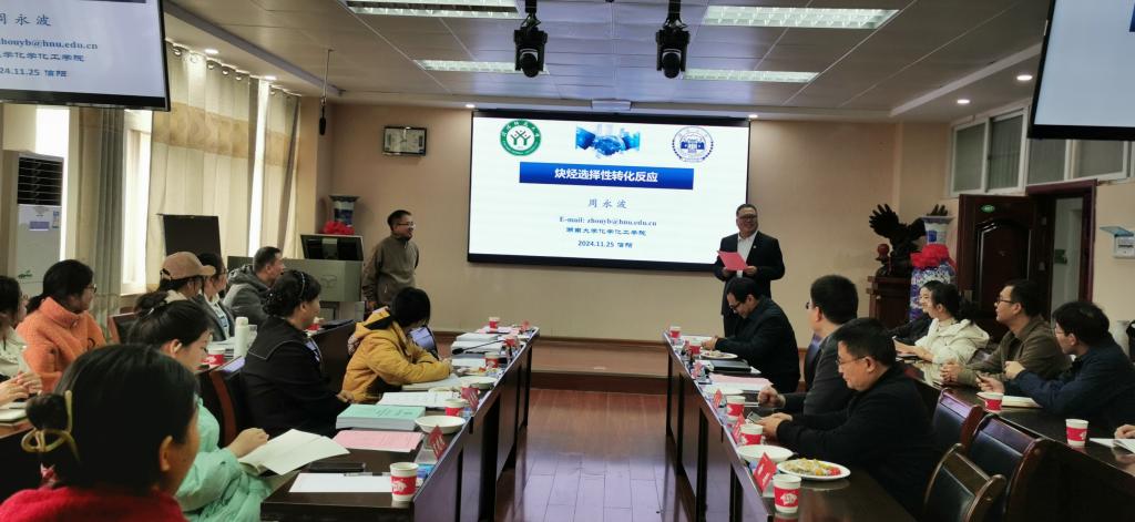 11月25日,应Beat365唯一官方网站邀请,湖南大学周永波教授在化学楼407会议室为我校师生作题为“炔烃选择性转化反应”的学术报告。Beat365唯一官方网站青年教师及研究生聆听了报告,报告会由Beat365唯一官方网站院长曹俊涛教授主持。