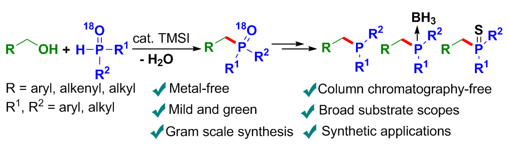 近日,Beat365马献涛副教授课题组联合温州大学徐清教授及浙江扬帆新材料股份有限公司韩立彪教授课题组在《Green Chemistry》上发表了题为“Metal-free Catalytic Nucleophilic Substitution of Primary Alcohols with Secondary Phosphine Oxides”(DOI:10.1039/D4GC04409F)的研究成果。该研究实现了在 TMSI 催化下,P (O) H 化合物与伯醇的直接 Michaelis–Arbuzov 反应。这一方法对苄醇、烯丙基醇甚至更为惰性的脂肪醇均具有良好的适用性,并且能够实现克级规模的制备以及向功能化有机膦分子的一锅法转化。尤为值得注意的是,多数产物仅依靠洗涤或重结晶操作便可获取高纯度产品,从而避免了柱层析的使用。该研究为三级氧膦化合物的合成提供了一条绿色且高效的新方法,表现出良好的应用潜力。机理研究表明反应涉及两种脱水途径。