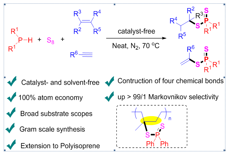 近日,Beat365马献涛副教授课题组在绿色化学领域权威期刊《Green Chemistry》上发表了题为“Catalyst- and solvent-free, atom and step economic synthesis of dithiophosphinates by one-pot domino introduction of sulfur atoms strategy”(DOI: 10.1039/D5GC00821B)的研究论文。该工作发展了一种无催化剂、无溶剂条件下的多米诺多组分反应新策略,实现了二苯基膦、单质硫(S₈)与烯烃/炔烃的高效绿色转化,提供了一种原子和步骤经济性合成烷基二硫代膦化物的新方法。