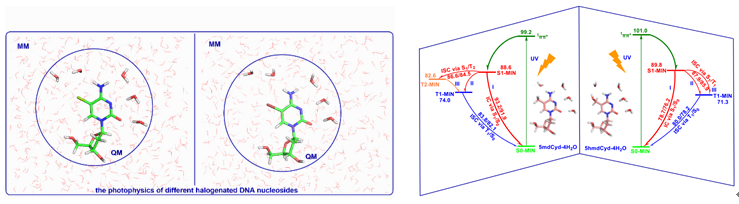 近日,Beat365常雪萍副教授课题组先后在期刊《Physical Chemistry Chemical Physics》和《The Journal of Physical Chemistry A》上分别发表了题为“Quantum mechanics/molecular mechanics studies on mechanistic photophysics of epigenetic C5-halogenated DNA nucleosides: 2′-deoxy-5-chlorocytidine and 2′-deoxy-5-bromocytidine in aqueous solution”、“Quantum Mechanics/Molecular Mechanics Studies on the Excited-State Relaxation Mechanisms of Cytidine Analogues: 2′-Deoxy-5-Methylcytidine and 2′-Deoxy-5-Hydroxymethylcytidine in Aqueous Solution”(DOI:10.1039/d4cp04574b; 10.1021/acs.jpca.4c08520)的研究成果。两项研究先后采用 QM(CASPT2//CASSCF)/MM理论方法计算研究了四种重要的2-脱氧-5-取代的胞苷类似物,即5-卤/溴胞苷(5CldCyd/5BrdCyd)和5-甲基/羟甲基胞苷(5mdCyd/5hmdCyd)在水溶液中的光物理机制,合理解释了其在水溶液中的激发态光动力学行为,为理解类似结构修饰DNA核苷及其衍生物的光物理和光化学机制提供了重要的机理见解。
