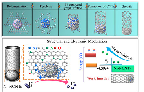 近日,Beat365陈明博士在国际著名学术期刊Chemistry of materials上发表了题为“Controlled Synthesis of Nickel Encapsulated into Nitrogen-Doped Carbon Nanotubes with Covalent Bonded Interfaces: the Structural and Electronic Modulation Strategy for Efficient Electrocatalyst in Dye-Sensitized Solar Cells”的研究论文。该论文主要报道了异质键合结构金属-氮-碳纳米管的新型合成方法及其作为染料敏化太阳能电池高效电催化剂的应用性能研究。相比传统的电弧与热解方法,该研究工作创新性地采用醋酸镍和三聚氰胺作为起始原料,利用金属镍催化碳纳米管顶端生长原理,在更低温度下简易有效地制备了金属镍、氮改性的多功能碳纳米管,且金属镍被包埋在碳纳米管内有效防止了镍纳米粒子的氧化、聚集以及腐蚀,同时又高效构建了金属-氮-碳共价的活性催化界面结构。此种设计合成的表面结构与电子改性的金属-氮-碳纳米管作为染料敏化太阳能电池对电极电催化剂,获得了相比贵金属铂对电极更高的催化性能与光电转换效率,化学稳定性更优。该新型碳纳米管制备方法简易,反应温度低,极易用于多功能金属-氮-碳纳米管的工业化生产,在电催化领域具有广阔的应用前景。Chemistry of materials是化学类一区期刊,影响因子9.466,在材料化学领域具有很高的影响力。论文链接:http://pubs.acs.org/doi/10.1021/acs.chemmater.7b03385