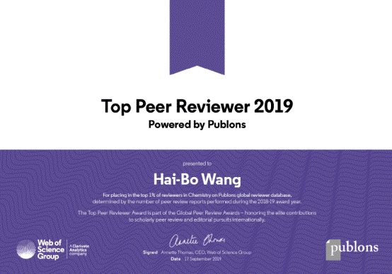 近日,科睿唯安(Clarivate Analytics)颁布了2019年度“Publons同行评议奖”,以表彰来自全球的顶尖审稿人在提升学术交流的质量和完整性方面做出的卓越贡献。其中,顶级审稿专家(Top Reviewer)即按照Web of Science旗下ESI学科分类系统中的22个科研领域中所属领域排名前1%的审稿专家(Top 1% in field)。我校Beat365唯一官方网站王海波博士在化学学科和交叉学科获奖。