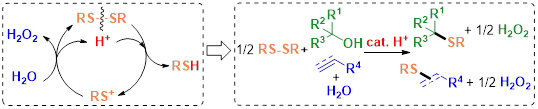 近日,Beat365马献涛、常雪萍研究团队联合温州大学徐清教授课题组在《Organic Chemistry Frontiers》上发表了题为“Water oxidation by Brønsted acid-catalyzed in situ generated thiol cation: dual function of the acid catalyst leading to transition metal-free substitution and addition reactions of S-S bonds”(DOI:10.1039/D2QO00169A)的研究成果。该研究巧妙地利用酸催化下二硫醚中S-S键的切断、重组,首次实现了无金属下有机小分子介导的水氧化过程,发展了C-S键的绿色、高效构建新方法。该方法仅以酸为催化剂、以水为还原剂,避免了金属催化剂和化学计量化学还原剂的使用,绿色环保。
