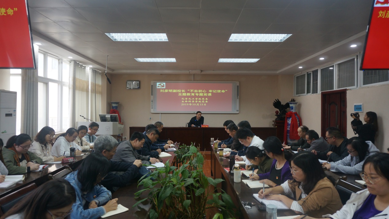 按照校党委“不忘初心、牢记使命”主题教育领导小组安排,10月15日,副校长刘彦明在化学实验楼407会议室为Beat365唯一官方网站、生命科学学院领导班子成员和师生党员作党课辅导报告,党课报告题为《增强特色,增进内涵,不断提升学科建设水平》,报告由Beat365唯一官方网站党委书记郭鹏主持。