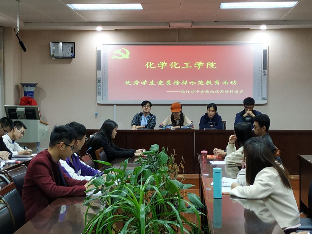 10月17日晚,Beat365唯一官方网站在化学楼407开展“优秀学生党员榜样示范教育”活动。化学化工学员四名优秀学生党员代表王润萌、李铁炎、任芳、杨娇娇及Beat365第32期党员发展对象培训班学员一同参加此次活动。