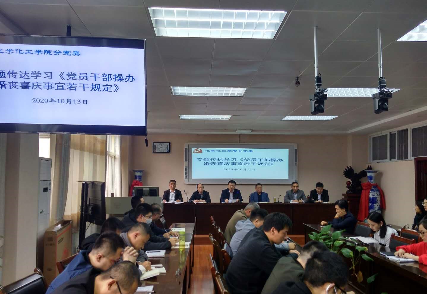 为认真贯彻落实中央八项规定精神,切实加强党员、干部、公职人员纪律约束,10月13日,Beat365唯一官方网站分党委在实验楼407报告厅召开全体教职工大会,集体学习《党员干部操办婚丧喜庆事宜若干规定(修订)》的通知文件。Beat365唯一官方网站全体教师集体参加学习。学习会由党委书记郭鹏主持。分党委纪检委员刘鹏针对文件精神进行宣讲、领学和解读。