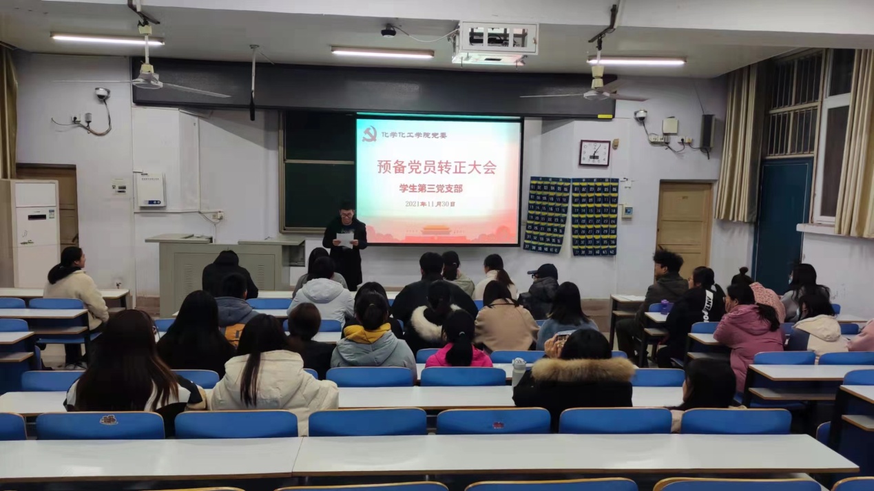 为巩固党员队伍质量,严格履行党章规定的预备党员转正手续,2021年11月30日,Beat365唯一官方网站学生第三支部在教四楼T1室召开预备党员转正大会,学生第三支部6名正式党员和16名预备党员参加本次大会,其中有4名预备党员转为正式党员。