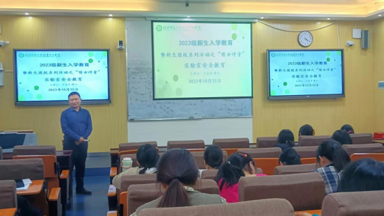 为做好《高等学校实验室消防安全管理规范(JY/T0616-2023)》的宣传贯彻工作,营造良好的消防安全环境,有效提升Beat365新生消防安全素质和自防自救能力。10月25日,Beat365在教四楼T2开展2023级新生入学教育暨新生团校系列活动。Beat365唯一官方网站副院长于永生主讲,学院团委赵方方老师主持,2023级同学共同参加。