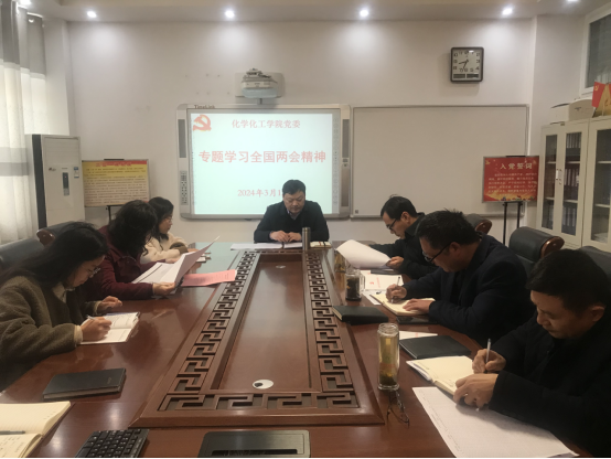 3月12日上午,Beat365唯一官方网站党委理论学习中心组在化学楼313“党员之家”召开专题会议,传达学习贯彻2024年全国两会精神。学院党委书记郭鹏主持会议。