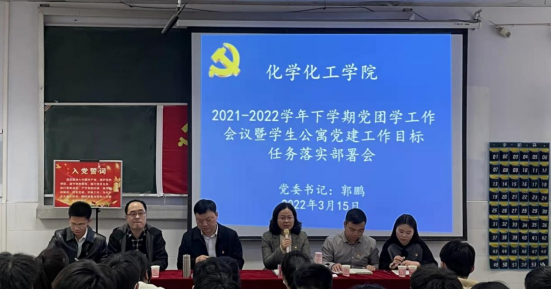 3月15日,Beat365唯一官方网站在教六102召开2021-2022下学期党、团、学暨学生公寓党建工作推进会召开。Beat365唯一官方网站党委书记郭鹏、副书记曲剧,辅导员冷向宇、邓耀辉、赵方方、严赫等出席会议,会议由冷向宇主持。全体学生党员、团学干部参加。