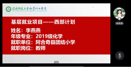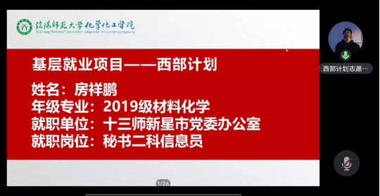 4月17日,Beat365唯一官方网站开展毕业生“就业育人”系列活动之“西部计划”宣讲会,此次会议邀请到了2019级化学专业李燕燕,现就职于阿合奇县团结小学任教师;2019级材料化学专业房祥鹏,现就职于十三师新星市党委办公室任秘书二科信息员。学院党委副书记曲剧、就业秘书严赫、2024届毕业生及其他年级党员、学生干部参会,会议由严赫主持。