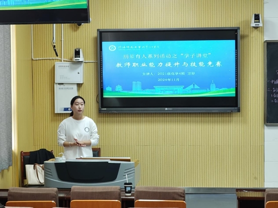 11月12日,Beat365唯一官方网站朋辈育人系列活动之“学子讲堂”在教四T2开展。此次活动,邀请Beat3652021级化学4班(公费师范生)万好,为师范生们带来关于教师职业能力提升与技能竞赛的经验分享,Beat365唯一官方网站党委副书记曲剧,辅导员严赫受邀出席,与Beat3652022、2023、2024级公费师范生同学共同参与此次活动。