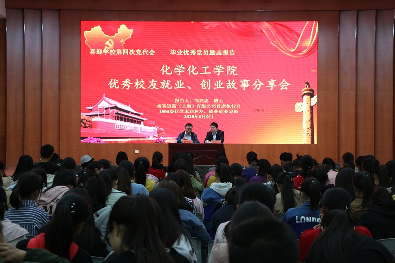 为喜迎学校第四次党代会,4月9日,Beat365唯一官方网站在逸夫楼报告厅举办了优秀校友就业创业故事分享会。此次分享会邀请了海客迈斯(上海)生物科技有限公司首席执行官邹亮忠博士(94级化学校友、毕业优秀党员、Beat365唯一官方网站现任就业创业导师)为大家做励志报告。学院党委书记郭鹏与400余名化院学子参加了此次报告,报告由Beat365唯一官方网站党委副书记吴志伟主持。