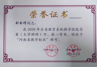 近期,Beat365唯一官方网站教师在河南省教育厅、河南省总工会组织的2020年度教学技能竞赛中再获佳绩,通过层层选拔,被学校选送的Beat365青年教师刘会俏不负众望,斩获一等奖,同时被授予 “河南省教学标兵”称号并获发奖章。