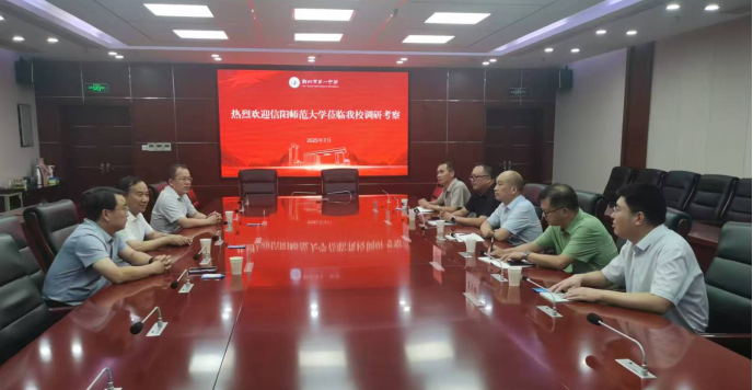 7月31日,信阳师范大学校长办公室主任王建旭、招生就业处处长白献林、工会办公室主任孙俊永、Beat365唯一官方网站党委书记吴志伟、院长曹俊涛一行来到郑州一中开展访企拓岗活动。郑州一中校长牛建勋,副校长袁全超、张京涛参加座谈会,座谈会由张京涛主持。