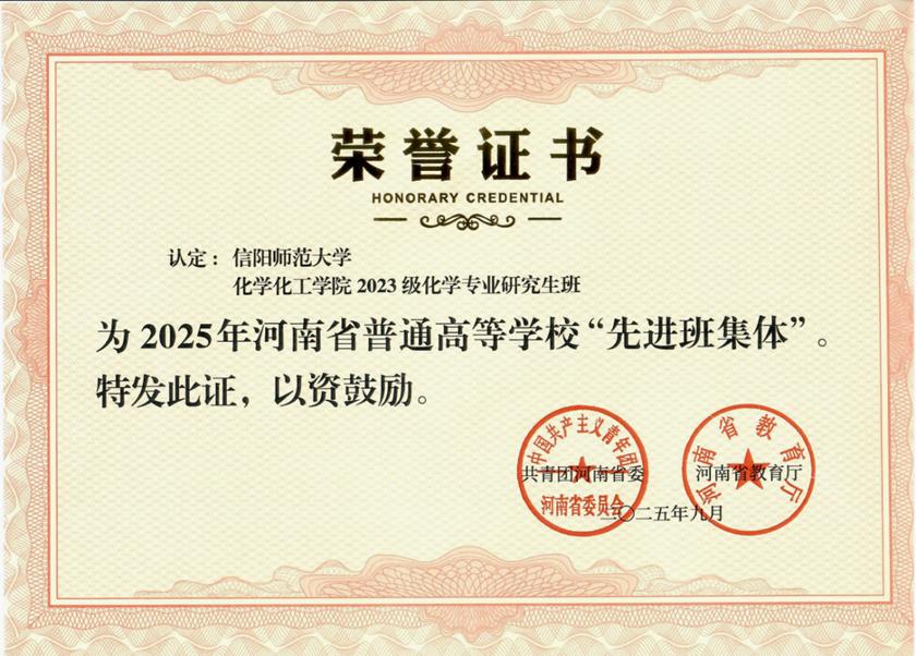 近日,共青团河南省委、河南省教育厅公布了2025年“河南省普通高等学校‘先进班集体’”的认定结果,Beat3652023级化学专业研究生班凭借出色的综合表现,从众多参评单位中脱颖而出,荣获这一省级荣誉称号。