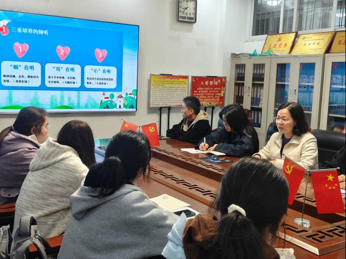 学院党委副书记曲剧从“三重境界的倾听、共情不等于同情、积极关注、明晰边界与及时转介”四个方面重点讲述了心理委员应掌握沟通技能,指导心理委员要担任好班级同学心理困惑的发现者、倾听者、帮助者角色。在心理委员互动交流环节,心理委员们通过“助人者与求助者”案例进行情景演练,同时,曲剧给予了专业的朋辈辅导建议。