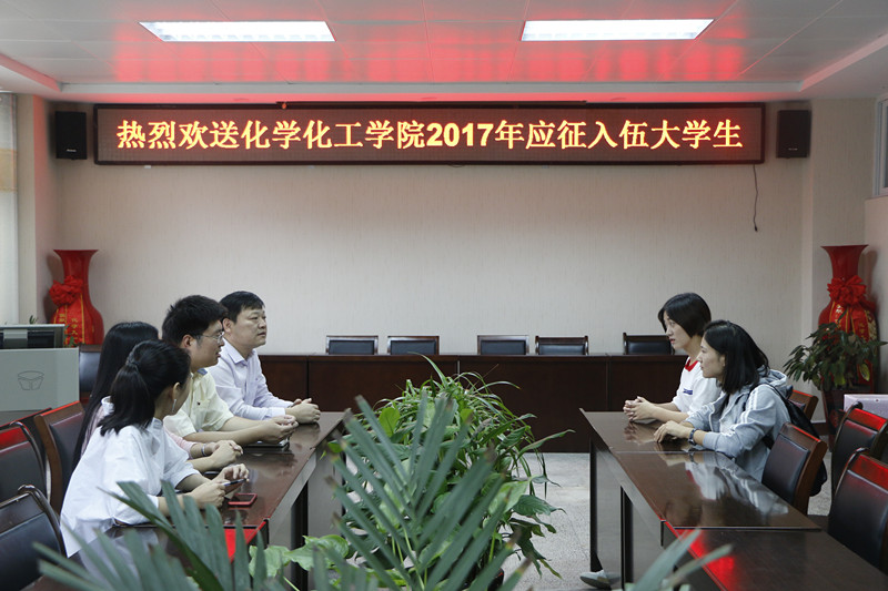 9月22日下午,Beat365唯一官方网站在化学实验楼407会议室欢送应征入伍大学生邓椿侠,化院党委书记郭鹏、党委副书记吴志伟,辅导员李中杰、王丽霞参加了欢送仪式,一起座谈的还有刚刚服役归来的入伍大学生刘丽霞。