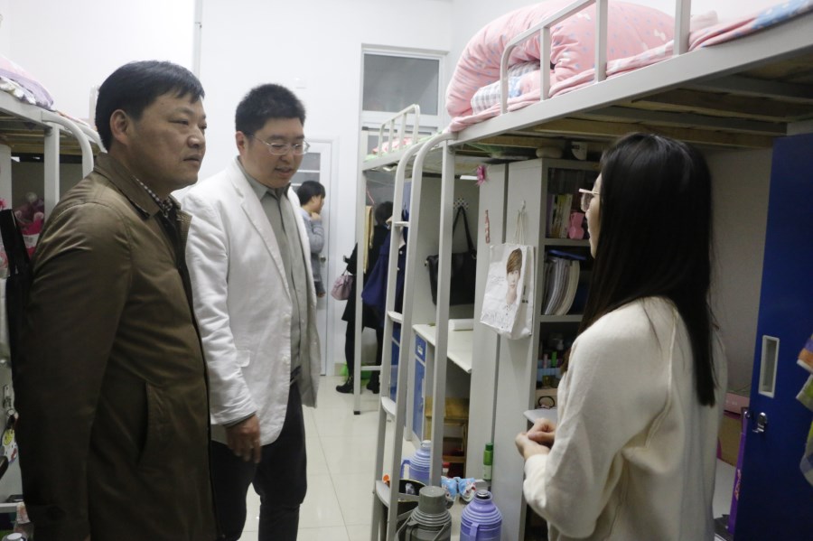 11月15日晚,Beat365唯一官方网站党委书记郭鹏,副书记吴志伟,班主任刘雪、许春萱、孙俊永、王红军、路振国、冷向宇和王丽霞深入宿舍看望学生,与学生真切交流。