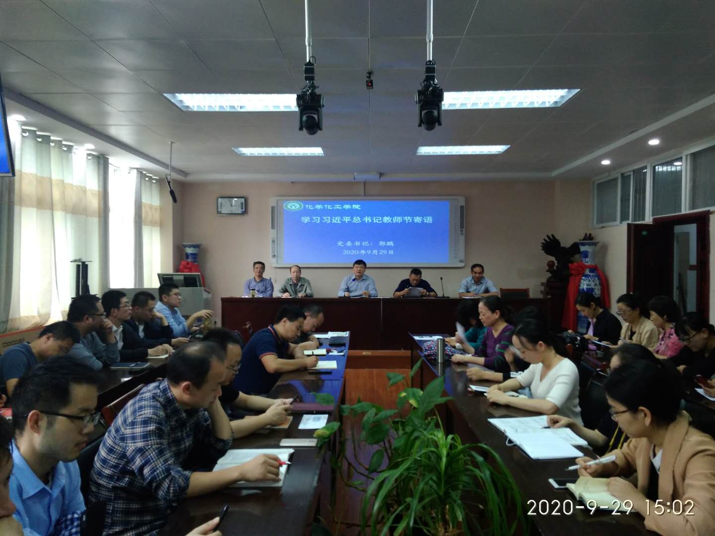 9月29日,Beat365唯一官方网站在化学楼407报告厅召开全体教职工大会,专题学习习总书记教师节寄语。Beat365唯一官方网站全体教师集体参加学习,学习会由党委书记郭鹏主持并宣讲领学解读。