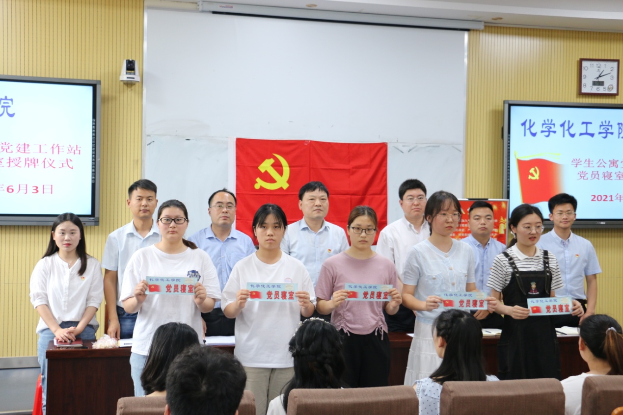 会上,郭鹏、吴志伟、冷向宇、邓耀辉、王少单向新入党党员代表发放党徽,为学生党员寝室授牌。