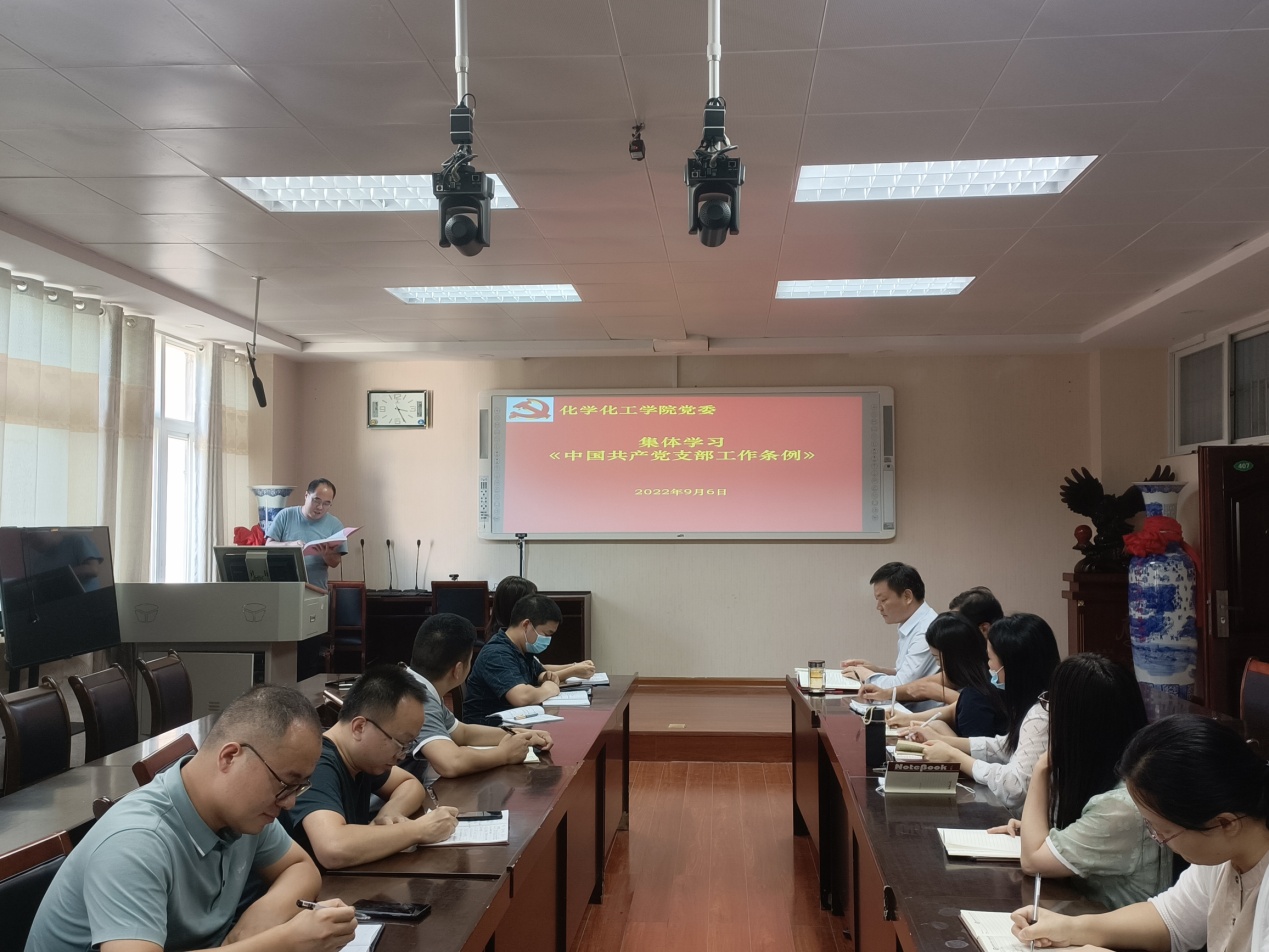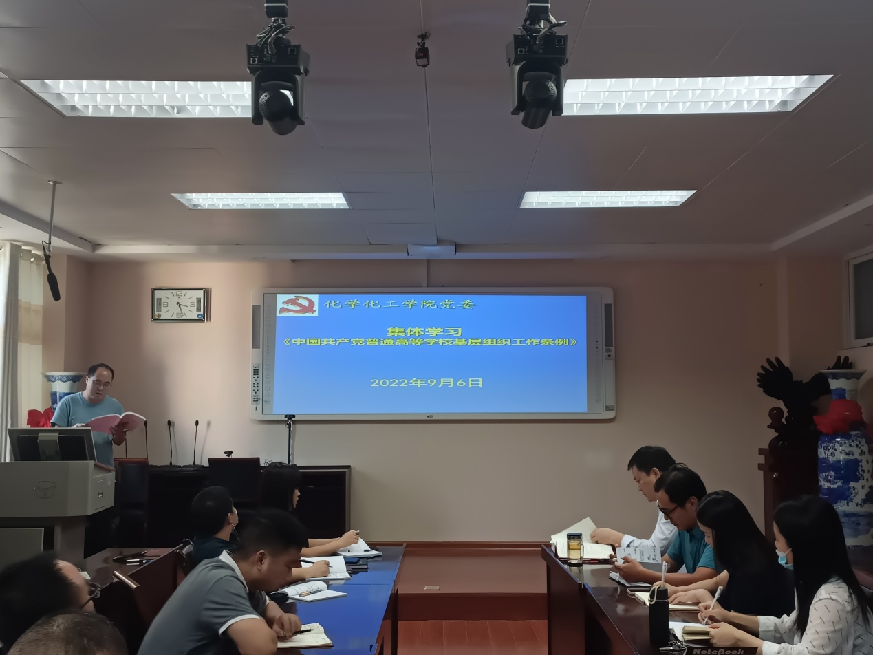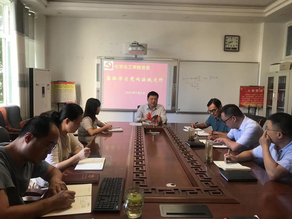 9月6日,Beat365唯一官方网站党组织在化学实验楼会议室集体学习党内法规,党委书记郭鹏、副书记曲剧、副院长曹俊涛、王红军、于永生及党支部书记参加扩大学习会议。学习活动由郭鹏主持。