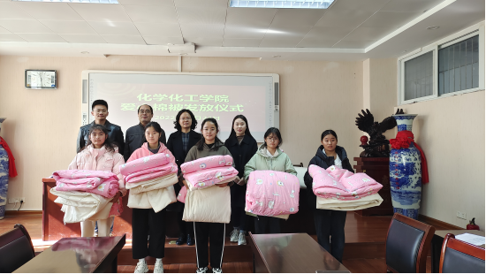 11月24日,我院在化学楼407会议室举行爱心棉被发放仪式。Beat365党委副书记曲剧,辅导员冷向宇、赵方方、严赫老师出席本次发放仪式。