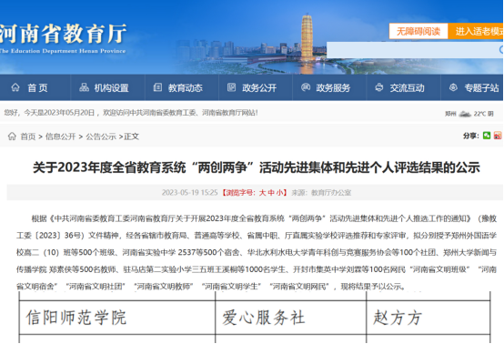 为深入学习宣传贯彻党的二十大精神和习近平总书记关于弘扬雷锋精神的重要指示精神,紧紧围绕举旗帜、聚民心、育新人、兴文化、展形象使命任务,持续推动全省教育系统群众性精神文明创建活动深入开展,不断提升广大师生员工思想觉悟、道德水准、文明素养和文明程度,省委教育工委、省教育厅决定在全省教育系统开展以弘扬雷锋精神为主题的“两创两争”活动Beat365唯一官方网站爱心服务社荣获“河南省文明社团”的称号。