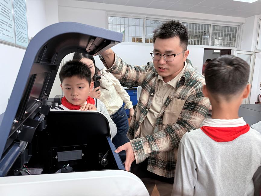随后,师生与家长一同来到二楼实验室。扫描电子显微镜、光谱仪等先进科研仪器设备有序摆放,瞬间抓住了学生们的注意力。讲解员围绕仪器的功能与原理展开讲解,用通俗的语言解释如何通过显微镜观察矿物微观结构、光谱仪怎样分析矿物成分,让学生们对科学实验背后的“神奇工具”有了直观认知。不少同学发出惊叹,称这是第一次看到如此精密的仪器,原来科学家研究矿物要靠这些“神器”,眼中满是对科学的好奇与向往。