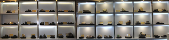 展厅展出有我国各地出产的珍珠岩原矿石,信阳师范学院于1984年成立了非金属材料研究所,是国内最早、最系统研究珍珠岩的机构,在国内外影响力较大。因此,国内发现的珍珠岩矿,基本上先送到这里进行分析成分、解析结构、测定性能,判断是否为珍珠岩及其品质,因此我们也保留了来自全国各地几乎所有的珍珠岩原矿石。